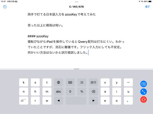 寝転びながらiPadを操作しているとQwery配列は打ちにくい。わかっていても難儀です。フリック入力も大きすぎて不安定。何かいい方法がないものやら。 side配列 親指の届く範囲にキーを集めたらいいのかな。 子音と母音を分割するgodan配列を参考にしました。…