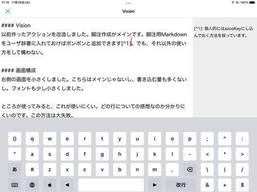 紙のノートを使うとき、縦線を引いて分割するやつ、あるじゃないですか。左側が本文というか板書を写す部分で、反対の右側が「その感想」みたいに使い分ける方法。 あれをデジタルでやろうとすると、あまり適切なエディタがない。そういう用途は考えられてい…