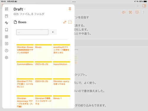 Scrapbox風のホームページを作るスクリプト。 今はサイドパネルに格納しています。 「検索できるファイル履歴」という感じで、よく使う。 ただ、スタイルが反映しない場合が多いので書き換えました。 Boxes.md 検索対象を x.path にしたのでフォルダでの絞り…