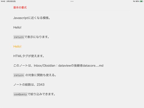 次世代Obsidianがデータベースとして補強されるみたいで。 datacore それに合わせ、dataviewも一新されるようです。 BRATで登録して触ってみました。 基本の書式 Javascriptに近くなる模様。 ```datacorejsx return "Hello!" ``` returnで表示になります。 `…