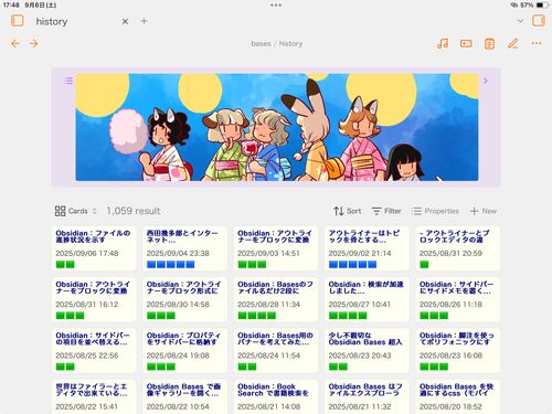 GridExplorerではできないこと。 Bases 蔵書管理にBasesはいいけど、 それ以外だとGridExplorerに分があります。 いろいろ融通が利く。 内容が表示されるのもありがたい。 そこでBasesならではの活用法を考えてみました。 history.md Inboxフォルダを履歴表…