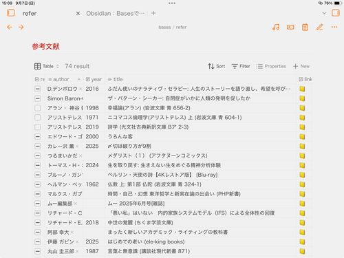 練り上がってきました。 refer 段々シンプルで使いやすくなってきました。 refer.md こんな感じのコードです。 --- search: --- ### 参考文献 ```base filters: and: - file.folder == "Clippings" - file.tags.contains("amazon") - if(this.search, file.n…